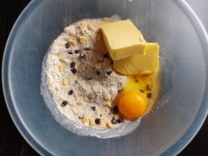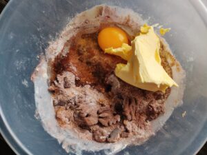 Do miski wsypać mieszankę ciastek, dodać masło (zimne z lodówki), wbić całe jajko. Dłonią wyrobić ciasto tak by wszystkie składniki się połączyły. Odrywać kawałki ciasta, formować kulki wielkości orzecha włoskiego, lekko spłaszczyć. Tak przygotowane ciastka układać na blachę wyłożoną papierem do pieczenia.