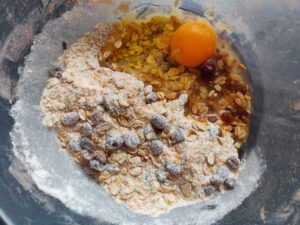 Do miski wsypać mieszankę ciastek, wlać olej, wbić całe jajko. Dłonią wyrobić ciasto tak by wszystkie składniki się połączyły. Odrywać kawałki ciasta, formować kulki wielkości orzecha włoskiego, lekko spłaszczyć. Tak przygotowane ciastka układać na blachę wyłożoną papierem do pieczenia.