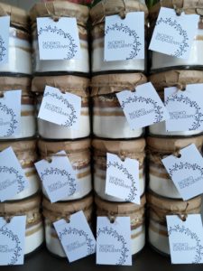 Składniki do wypieku ciastek są odmierzone i starannie układane w słoiku warstwami, następnie każdy słoik jest oklejany uroczą etykietą.